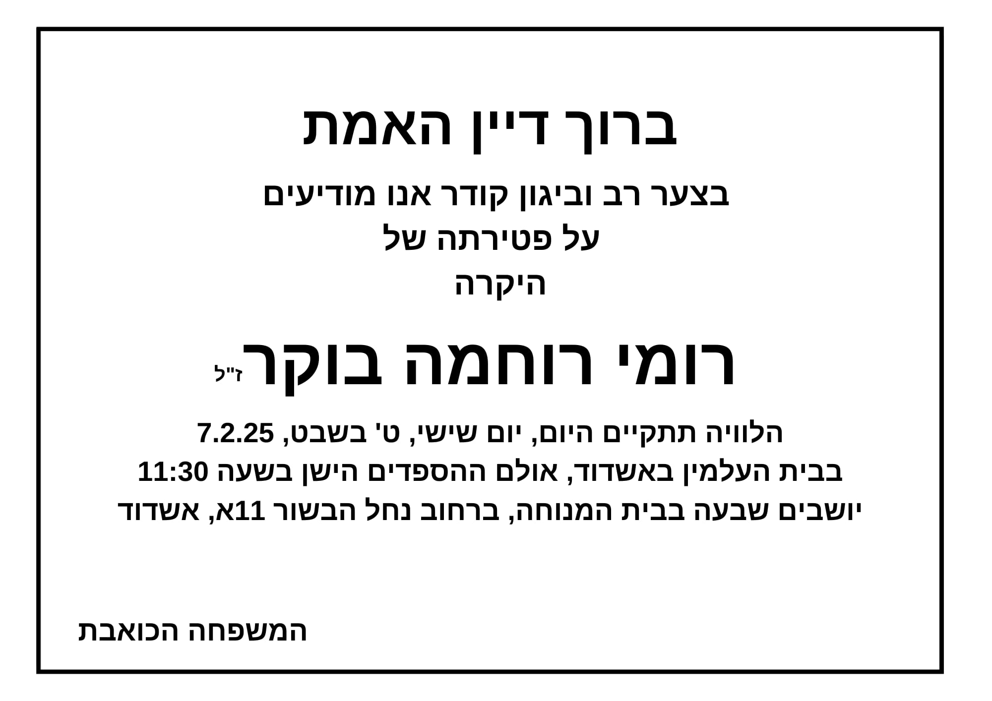 נפרדים מרוחמה היקרה: לאחר מס' שבועות בהם התמודדה באומץ עם ניתוח מורכב, לפנות בוקר נפטרה תושבת העיר רוחמה בוקובזה (בוקר) ז"ל, בבית החולים 'שערי צדק' בירושלים שם הייתה מאושפזת.